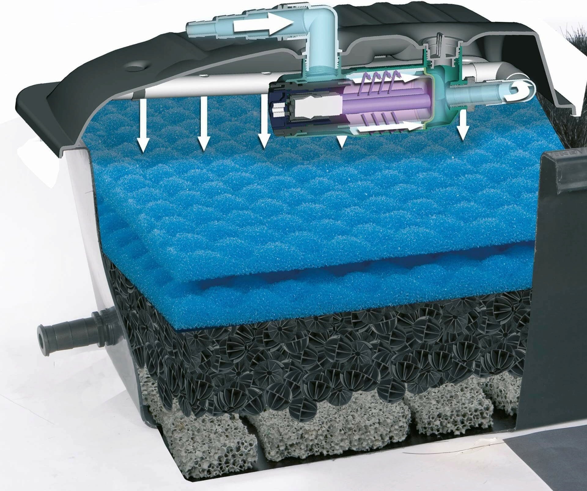 A szűrő működése közben a kezelt víz a szűrő alsó nyílásaiból kifolyik a tömlőkbe, amelyek visszaszállítják a tóba.