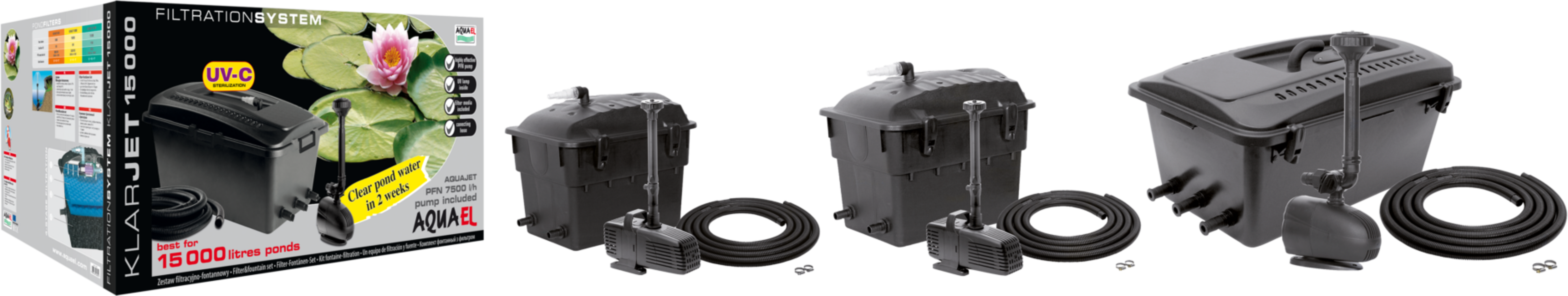 A standard KLARJET szűrő szett tartalmaz egy szűrőt, egy kompatibilis AQUAEL AQUAJET PFN-szivattyút, egy kerti tömlőt, egy használati útmutatót és 2 clipet. A KLARJET szűrő szett UV-sterilizálóval is felszerelt. A sterilizátor által kibocsátott UV-C fény hatékonyan küzd az algák, baktériumok és egyéb kórokozók ellen.