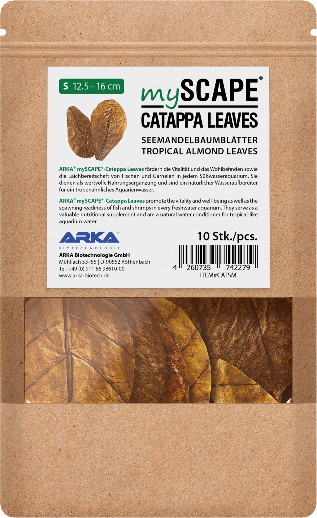 Az ARKA® mySCAPE®-Catappa Leaves minden édesvizes akváriumban támogatja a vitalitást és a jó közérzetet, valamint a halak és garnélák ívásra való hajlamát. Értékes tápkiegészítő és természetes vízkezelő a trópusi akváriumvíz számára.