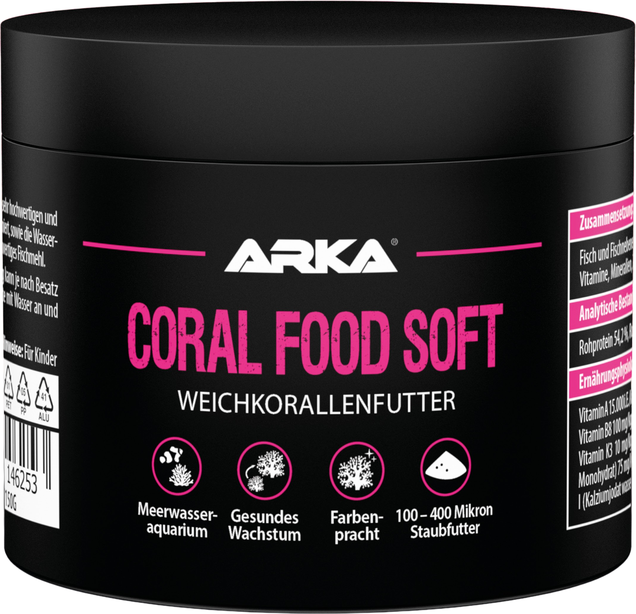 A Coral Food Soft egy hidegen préselt táppor a puha korallok optimális táplálásához. A nagyon jó minőségű és speciálisan összehangolt összetevőknek köszönhetően a természetes színek és növekedés optimalizálódik, a vízszennyezés pedig minimálisra csökken. A Coral Food Soft nem tartalmaz spirulinát (cianobaktériumokat) és gyengébb minőségű hallisztet.