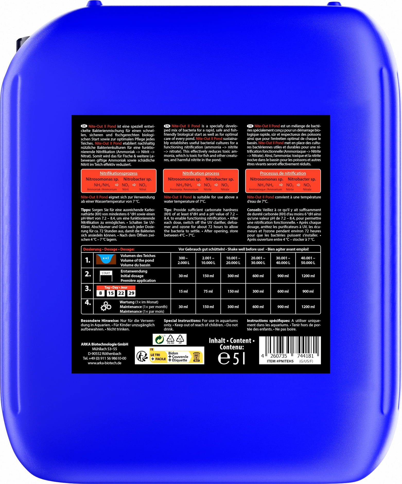 Az ARKA Nite-Out II Pond biológiailag halbarát indulást biztosít, valamint garantálja a tóvíz optimális ápolását. Egy speciálisan kifejlesztett baktériumkeverék nitrifikációval csökkenti a káros ammónia és nitrit mennyiségét. A készítmény 7 °C-os vízhőmérséklettől hatásos. Ahhoz, hogy a nitrifikáció hatékonyan működjön, a KH-nak legalább 6-nak kell lennie, a pH-értéknek pedig stabilnak 7,2 és 8,4 között.
