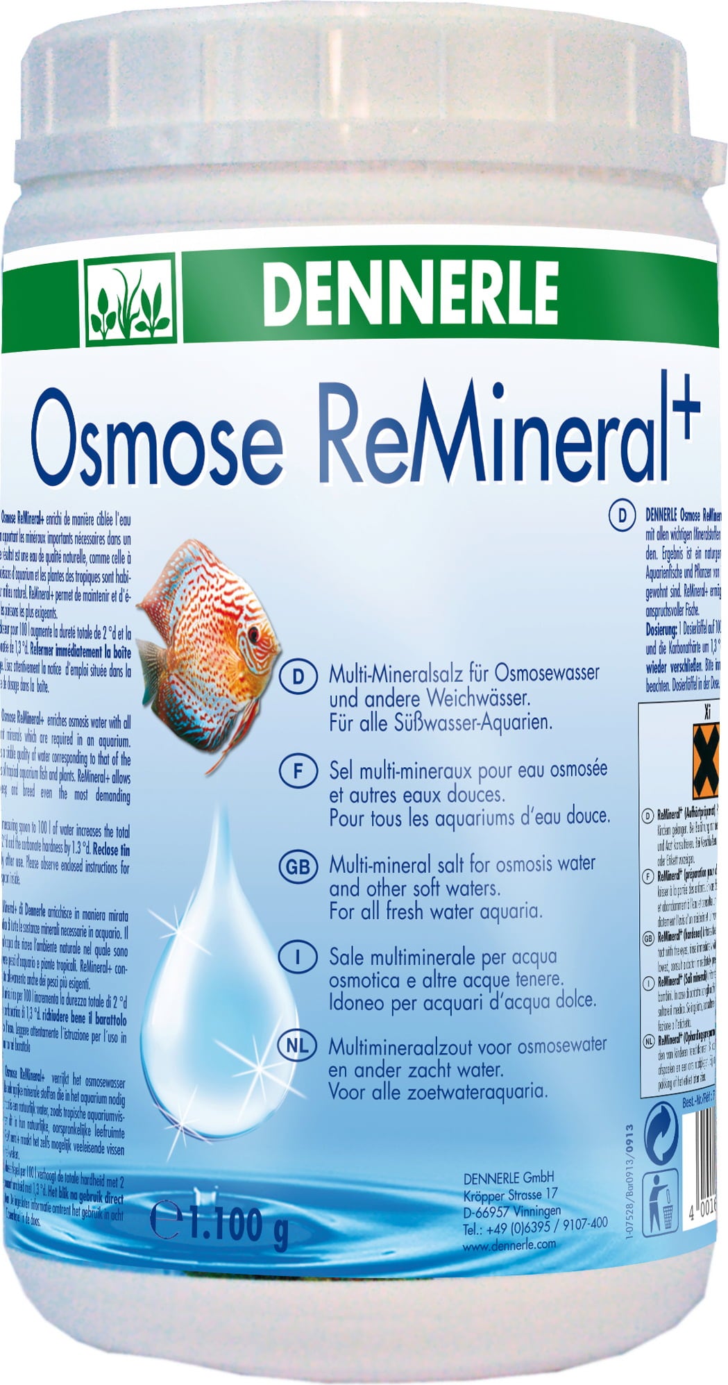 A Dennerle Ozmózis ReMineral+ segítségével az ozmózisos vizet az akváriumban szükséges összes fontos ásványi anyaggal elláthatja. A gondosan kiegyensúlyozott multi-ásványi készítmény a trópusi vizek természetes összetételén alapul. A teljes és karbonát keménység képzők stabilizálják a pH-értéket. Ezenkívül a halakat és a növényeket olyan értékes nyomelemekkel látják el, mint a bór, fluor, jód és sok más. Az esszenciális B-vitaminok védelmet nyújtanak a stressz ellen. A válogatott organikus hatóanyagok aktiválják a szűrőbaktériumokat. A Dennerle kizárólag nagy tisztaságú ásványi sókat dolgoz fel gyógyszerészeti minőségben! A ReMineral+ segítségével olyan vizet állíthat elő, amelyet a trópusi akváriumi halak és növények megszoktak a természetes vizekben. Ideális minden édesvizes akváriumhoz, különösen diszkoszhalak számára!