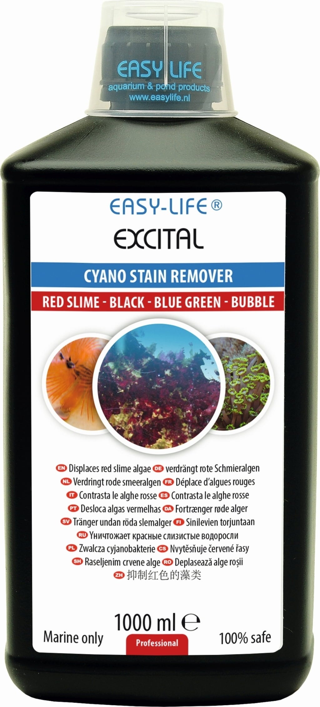A cianobaktériumok gyakran a víz hőmérsékletének emelkedése után jelennek meg, esetenként a víz nagy organikus terhelésével vagy a talajanyagban történő rothadással összefüggésben. Az Excital következetesen küzd a cianobaktériumok ellen, könnyen és biztonságosan használható, illetve ártalmatlan a halakra és a korallokra. Ha a fertőzöttség nagy, tanácsos először manuálisan eltávolítani a lehető legtöbb cianót, majd azonnal hozzáadni az Excital terméket.