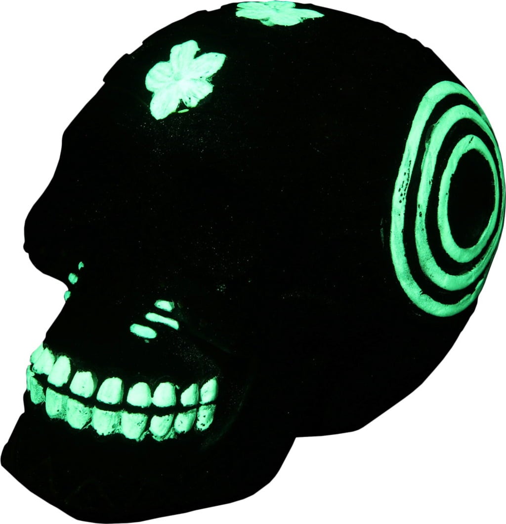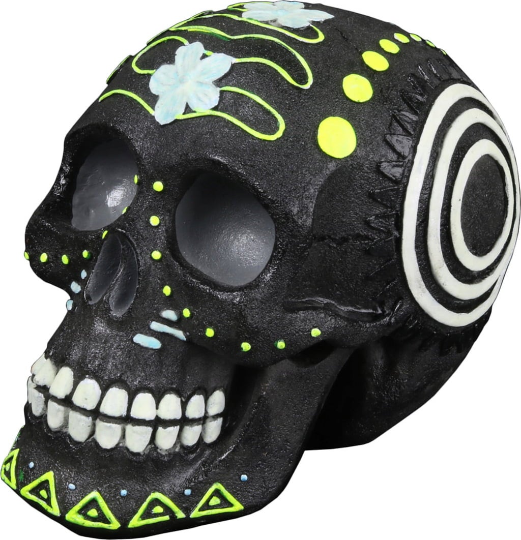 Ezek a színes koponyák az Aqua Della Dia de los Muertos-sorozatának dekorelemei. Nemcsak színesek, de különleges színnel is megfestettek. A dekorelem Glow-in-the-Dark hatással rendelkezik, valamint ultraibolya fényben fluoreszkál. Ezek a dekorációk poliészter gyantából készülnek, biztonságosak és nem befolyásolják az akvárium biológiai egyensúlyát. A dekoráció édes- és sós vizes akváriumokhoz alkalmas.