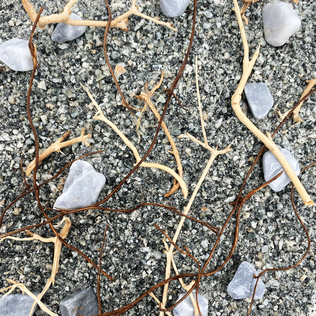 - Kavics, lekerekített kövek és gallyak