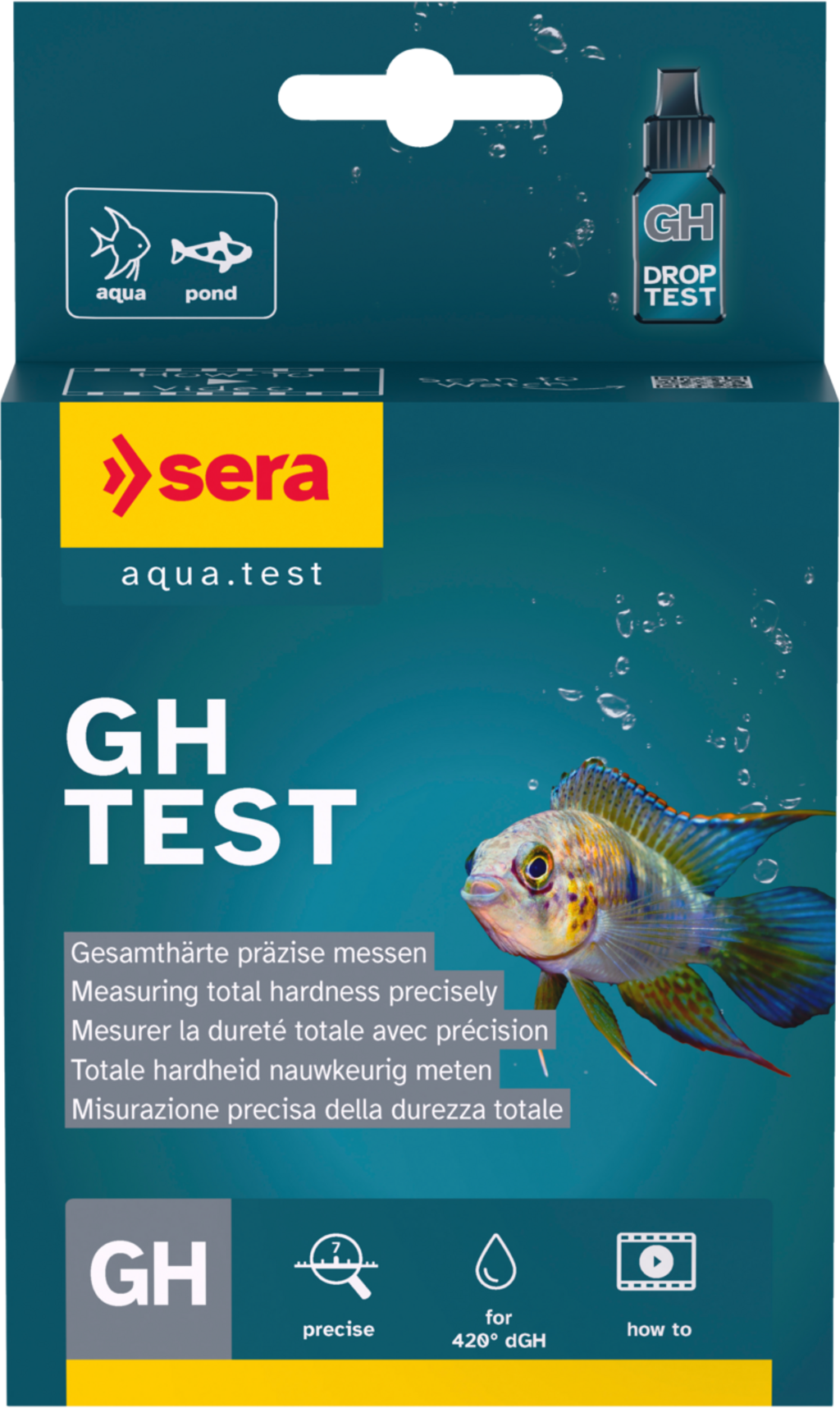 A sera GH-teszt egy vízteszt édesvizes akváriumok és kerti tavak teljes keménységének ellenőrzéséhez.