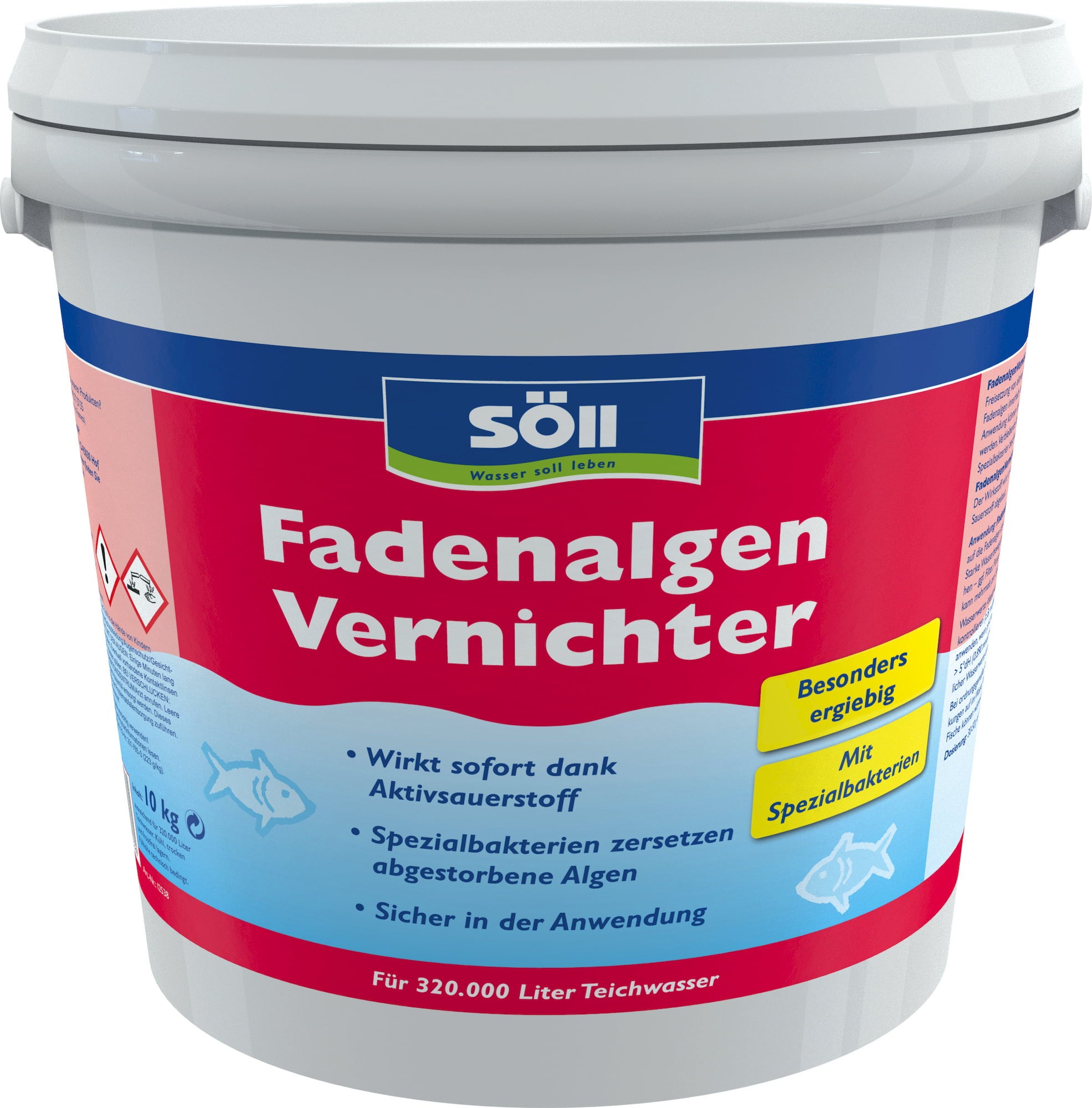 A Söll FadenalgenVernichter egy színtelen és hatékony készítmény, amely stabilizálja az algák növekedését. 24 órán belül aktív oxigént szabadít fel, illetve elpusztítja a felesleges algákat. Az "elpusztult" algák röviddel ezután hálóval eltávolíthatók. A többit a termékben található speciális baktériumok végzik: felgyorsítják az elhalt algák bomlási folyamatát. Néhány órán belül vízzé és oxigénné bomlik le.