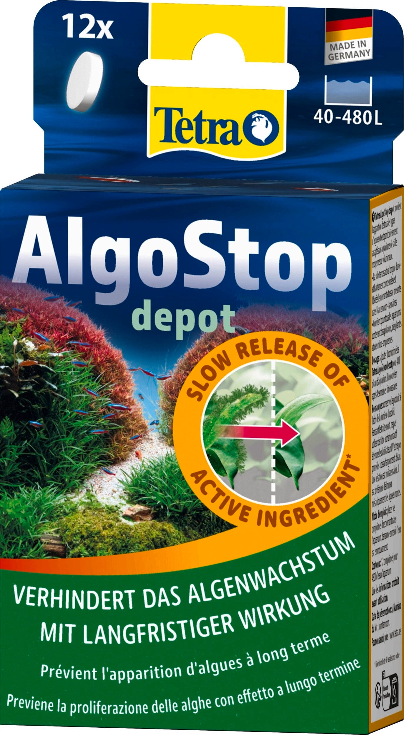 A Tetra AlgoStop Depot formatartó tabletták az algák célzott, hosszú távú leküzdésére szolgálnak az édesvízi akváriumokban. A tabletták elpusztítják az ecset- és fonalas algákat, valamint megakadályozzák az algák további növekedését. A Depot-hatóanyag körülbelül 6 héten keresztül adagolja a hatóanyagokat. Az elhalt növény- és algamaradványokat kézzel, hálóval kell eltávolítani az akváriumból, nehogy megváltoztassák a vízértéket. A lebegő anyagok kiszűrődnek.
