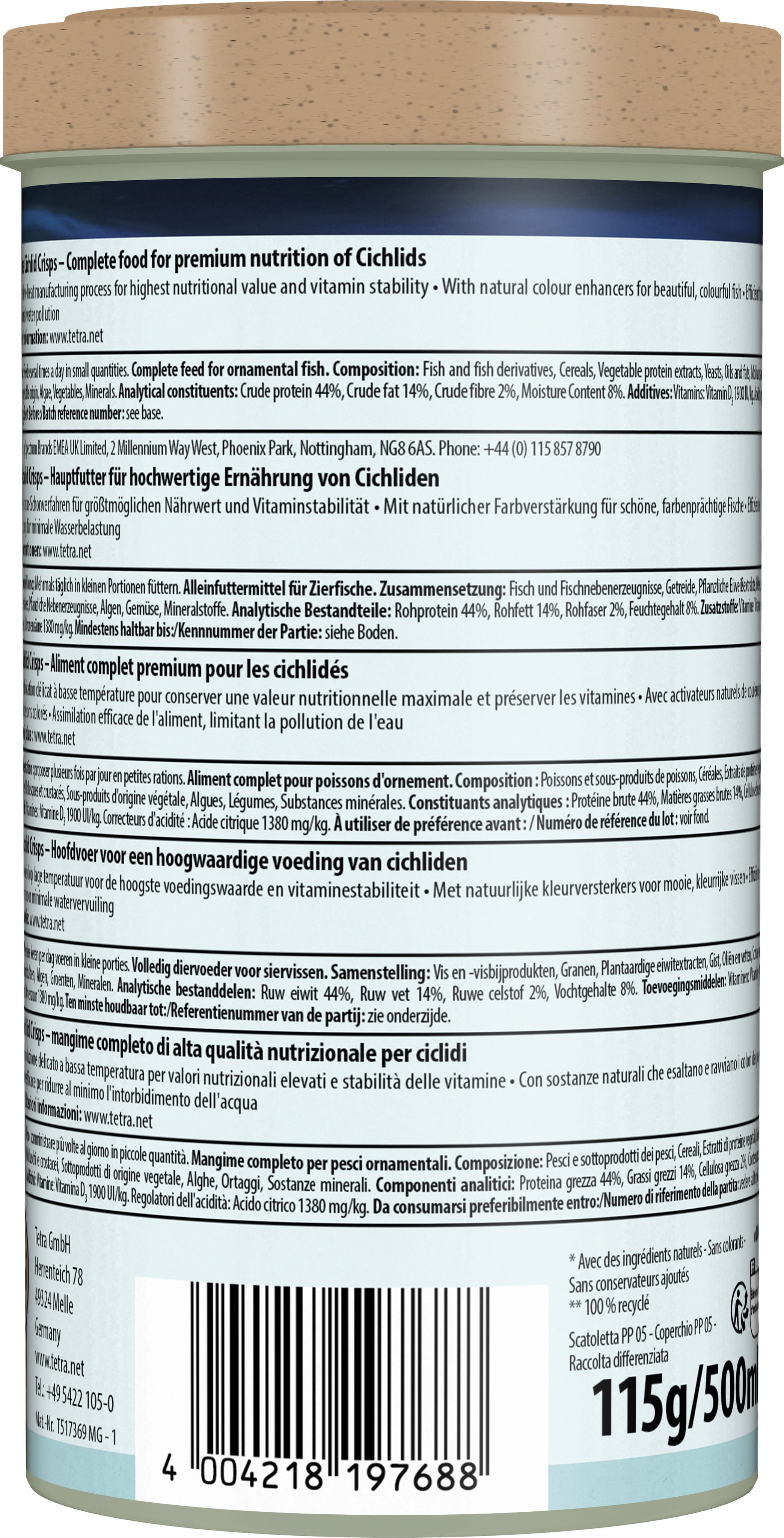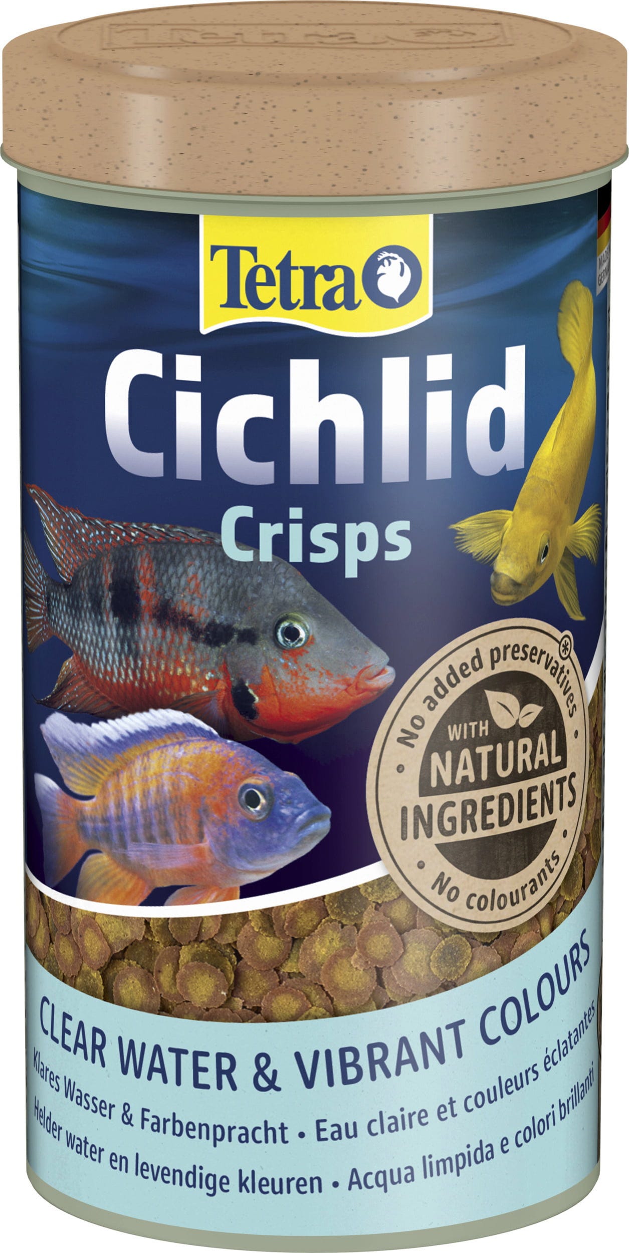 A Tetra Cichlid Crisps olyan Multi Crisp, amely az alacsony hőmérsékletű eljárásnak köszönhetően különösen magas tápértékkel rendelkezik, illetve bölcsőszájúhal-félék számára alkalmas. A természetes színfokozók és a speciális összetevők magas aránya biztosítja a gyönyörű és gazdag színvilág teljes kifejlődését. Az innovatív crisps jobb tápfelvételt mutat, ami kisebb vízszennyezést eredményez. A szabadalmaztatott BioActive formula erős immunrendszert biztosít.