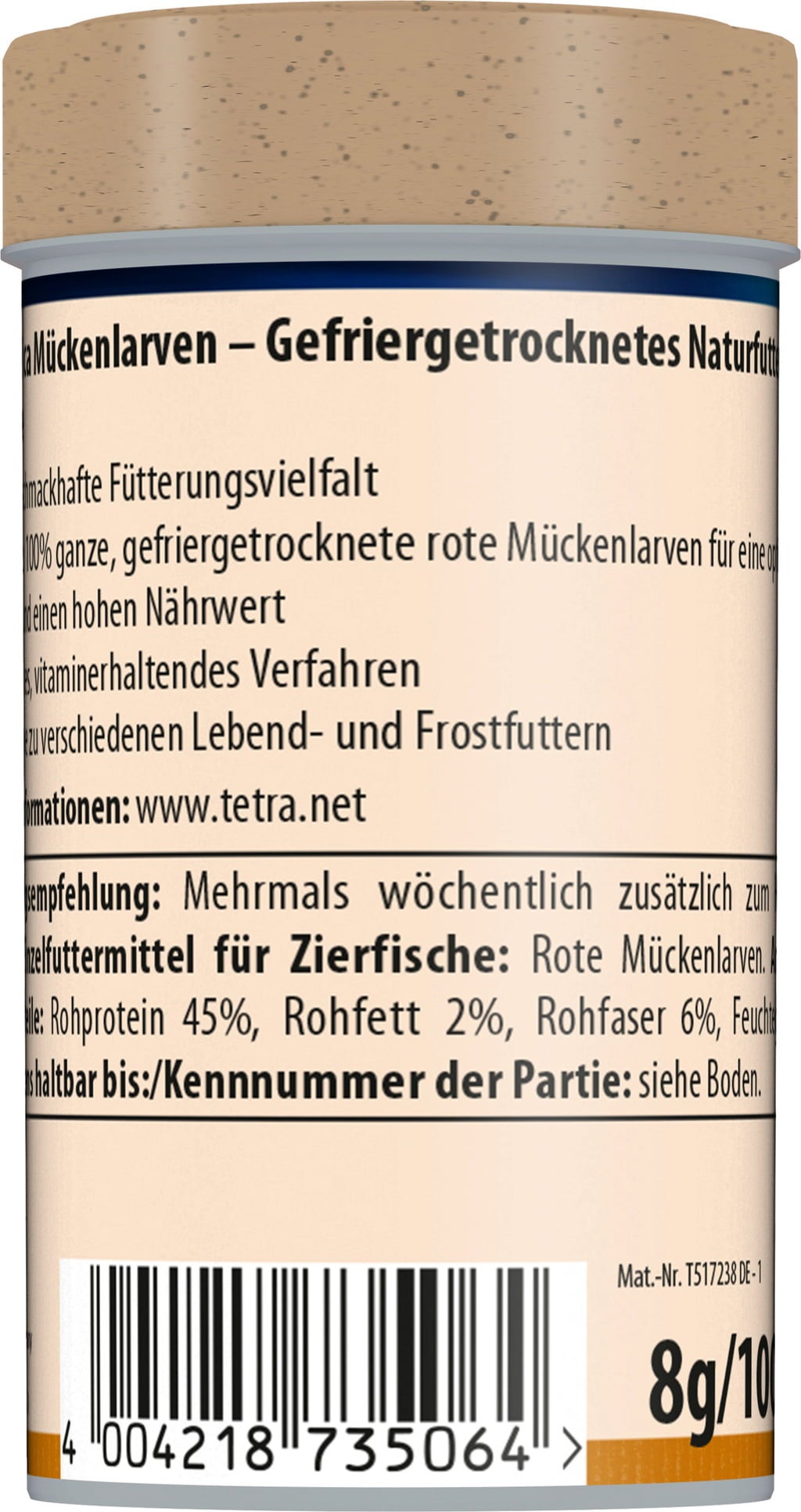 A Tetra Delica szúnyoglárva egy természetes csemege minden trópusi díszhal számára, illetve rendkívüli elfogadással rendelkezik és egy természetes fehérjeforrás a növekedés támogatásához. A szúnyoglárvákat gondosan és gyengéden fagyasztva szárítják, így megőrizve a természetes táplálék teljes tápanyagtartalmát. A Tetra Delica szúnyoglárvát a fajnak megfelelő tápláláshoz használják különféle ízesítéssel. Tökéletes tápkiegészítő a Tetra főtápokhoz, mint például a TetraMin.