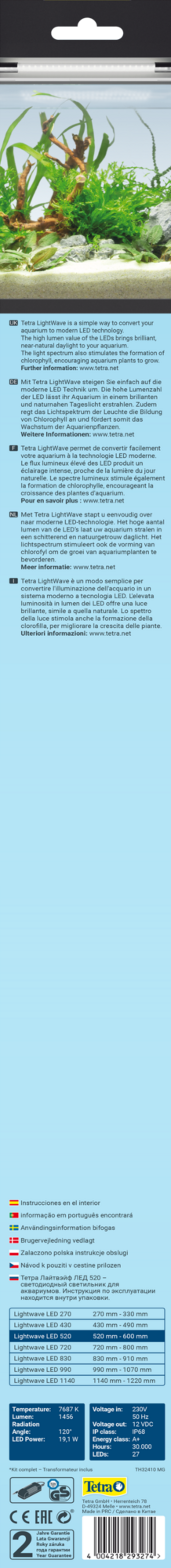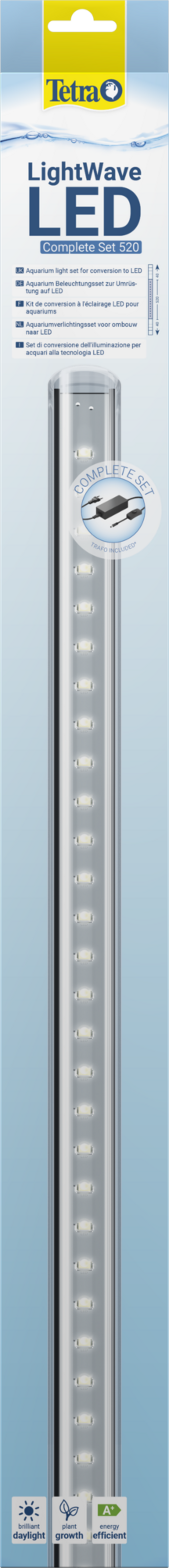 A Tetra LightWave komplett szett különösen alkalmas a modern LED-technológiára való egyszerű átálláshoz. A szett a tápegységen kívül a rögzítéshez szükséges összes adaptert tartalmazza, így lehetővé téve a lámpa azonnali üzembe helyezését. A LED-világítás nagy lumenszámának köszönhetően az akvárium természetes és kiváló nappali fényben ragyog. Ezenkívül a lámpa fényspektruma serkenti a klorofill képződését, ami támogatja az akváriumi növények növekedését.