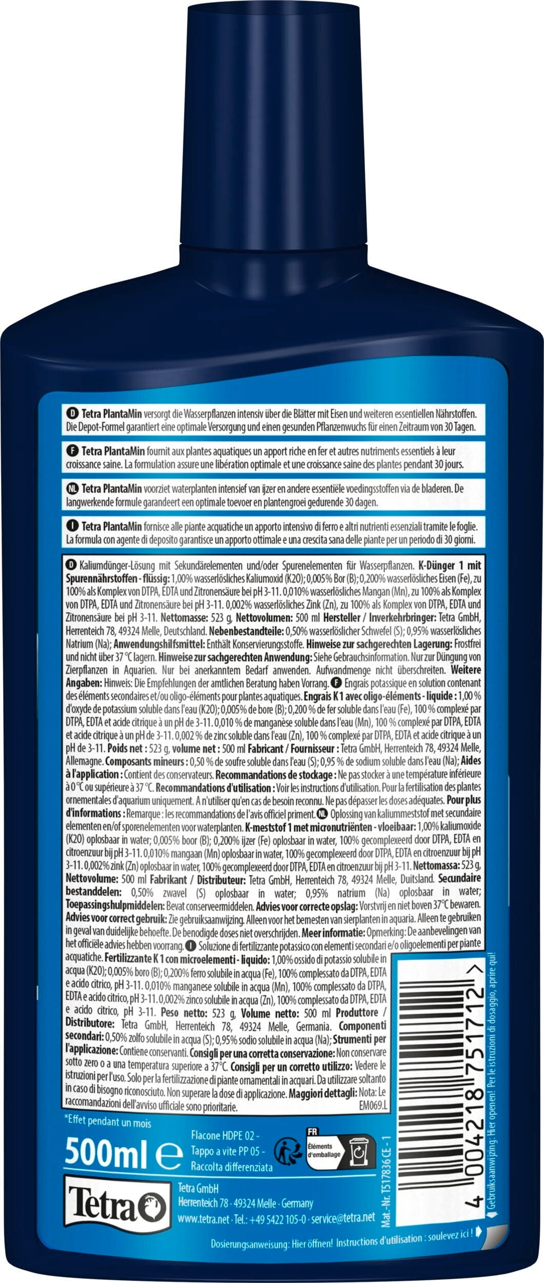 A speciális Depot-formulának köszönhetően a Tetra PlantaMin-ben található tápanyagok 4 hétig állnak a növények rendelkezésére. A vas, kálium, mangán és más esszenciális nyomelemek biztosítják az egészséges növénynövekedést. Az erőteljes és egészséges növények a legjobbak az algamegelőzéshez. A PlantaMin lehetővé teszi a tápanyagok felszívódását a leveleken keresztül, és nem szennyezi az akvárium vizét, mivel nitrát- és foszfátmentes.