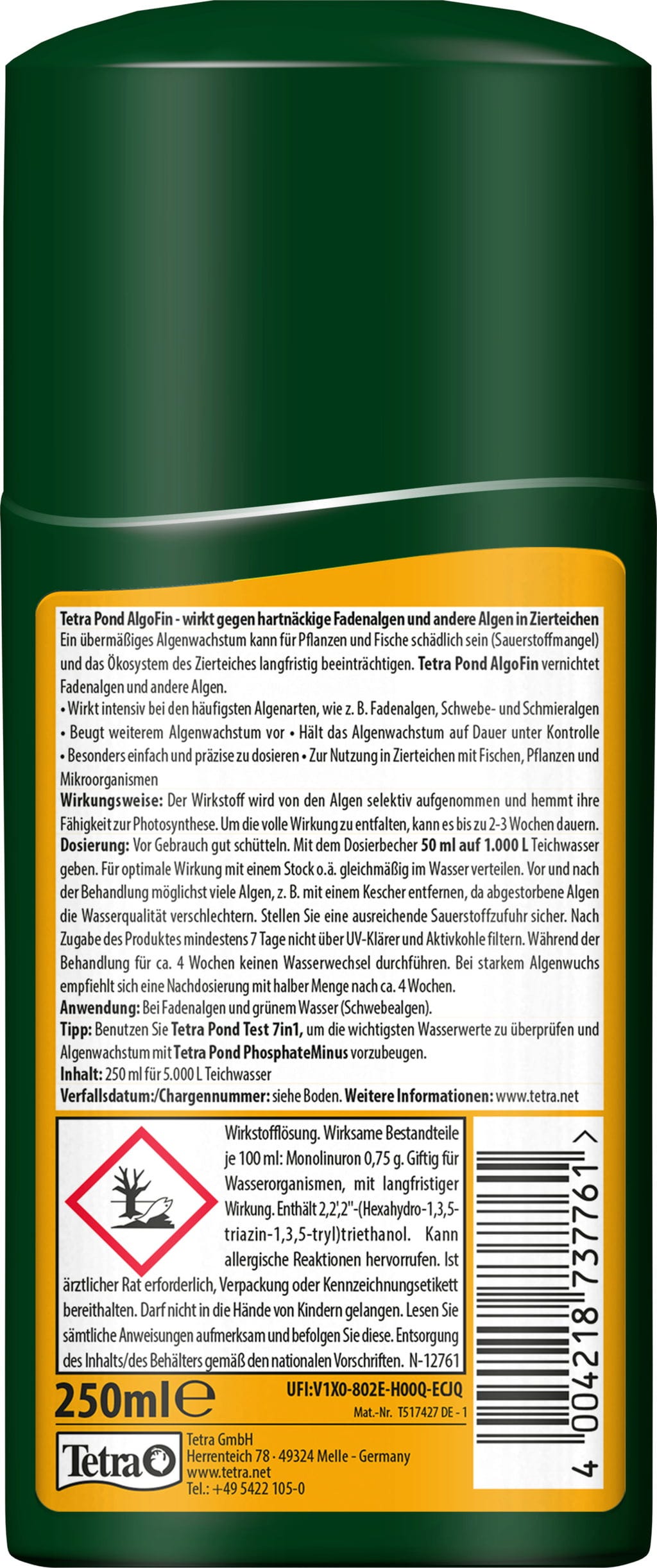 A Tetra Pond AlgoFin a makacs szálas, lebegő és nyálkás algák hatékony elpusztítására szolgál a kerti tóban. Az AlgoFin célzottan avatkozik be az algák organizmusába és anyagcseréjébe, így meggátolva azok fotoszintetizáló képességét.