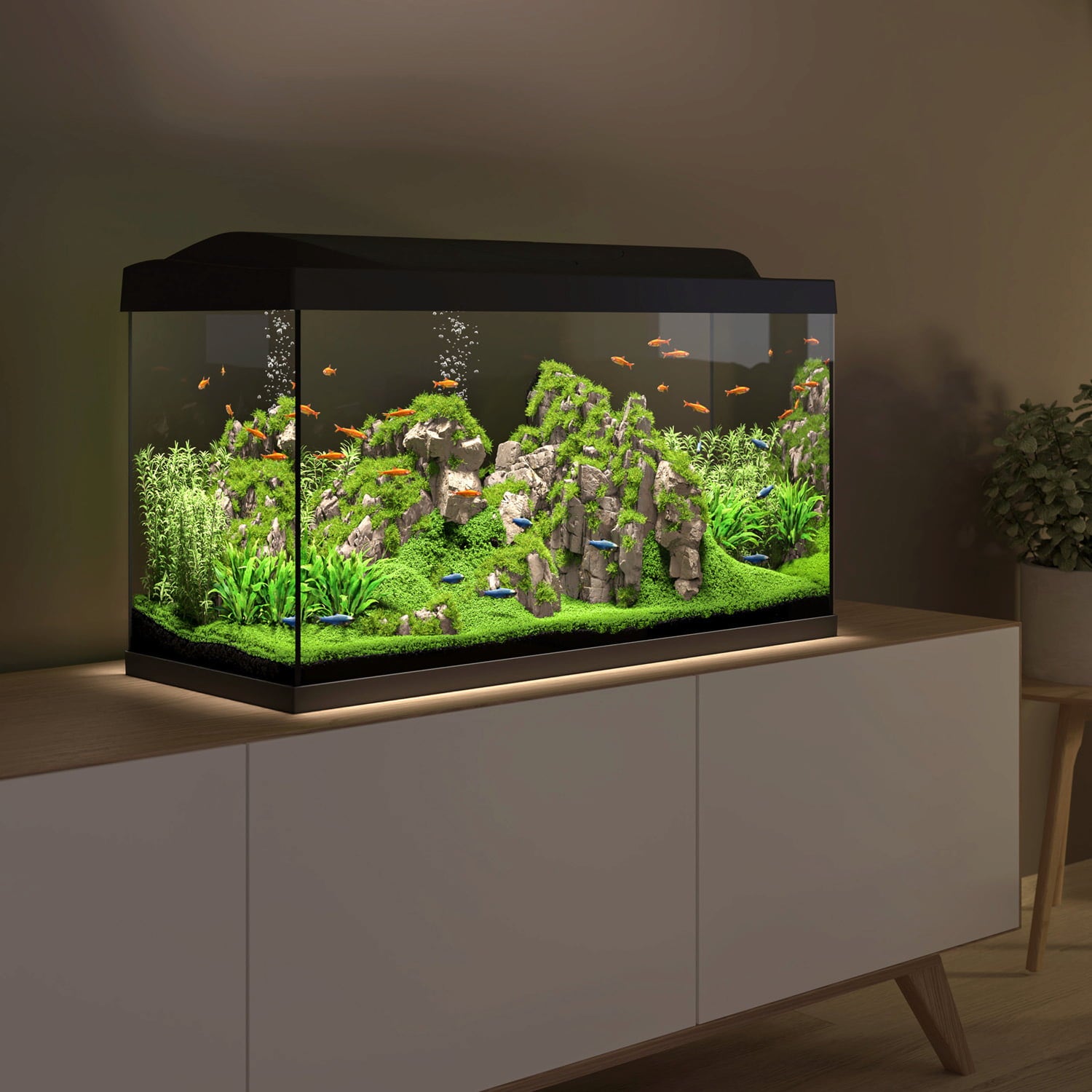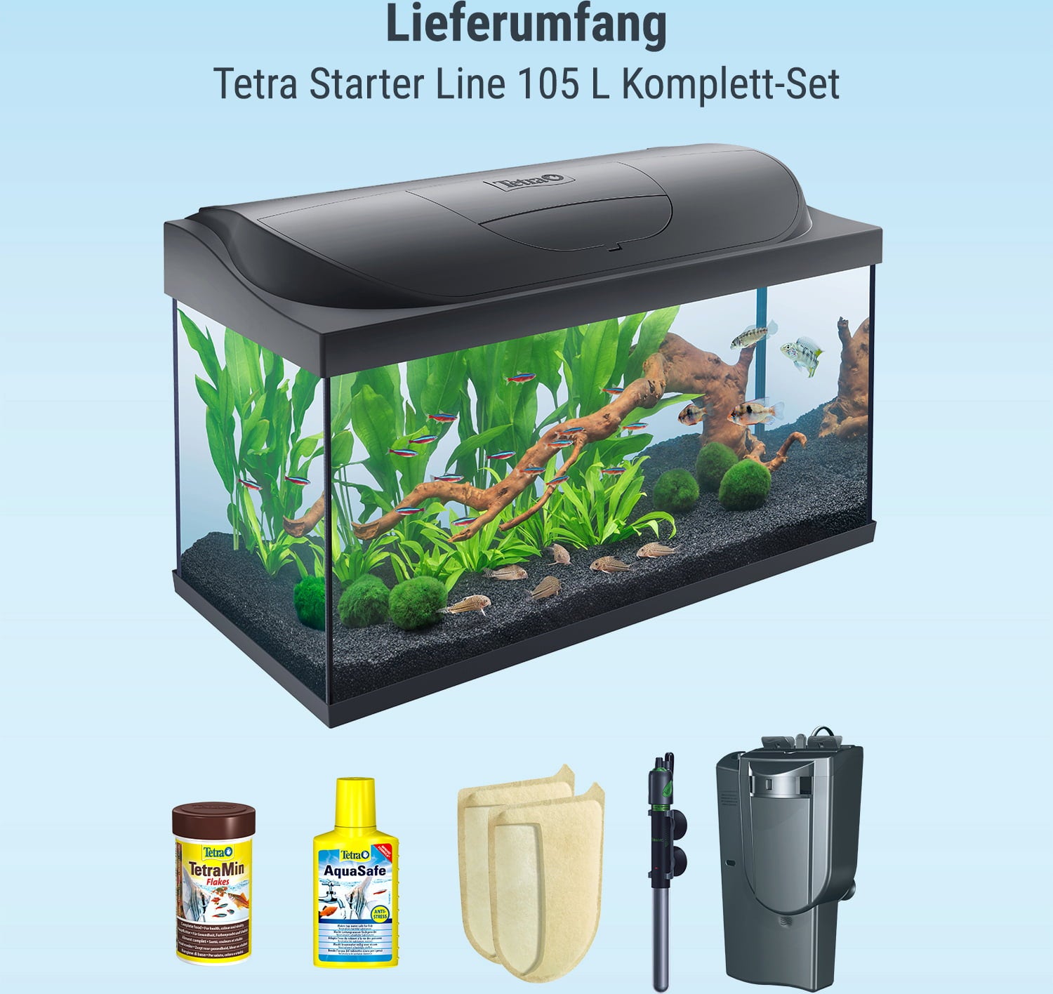 Annak érdekében, hogy a víz alatti világ lakói valóban otthon érezzék magukat, egy megbízható 100 wattos fűtőberendezés állandó 25°C-os hőmérsékletet tart fenn – Önnek semmi másról nem kell gondoskodnia! És mivel a megfelelő kezdés nem lehet félmegoldás, a csomag még a TetraMin eledelt és a Tetra AquaSafe vízkondicionálót is tartalmazza – így azonnal kezdődhet az akvarisztikai élmény!