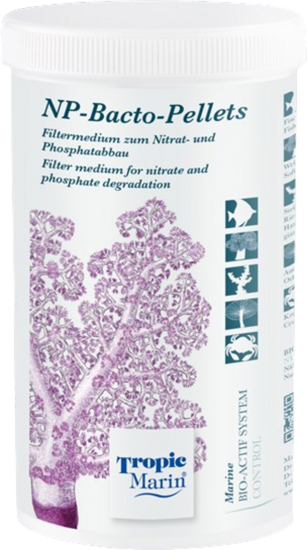 A Tropic Marin NP-Bacto-Pellets egy organikus szűrőközeg, amely kompakt méreténél fogva ideális fluidágyas szűrőkhöz és pellet-reaktorokhoz. Az organikus szűrőközeg természetes polimerek keverékéből áll, amelyek hatékonyan és eredményesen bontják le a nitrátot és a foszfátot azáltal, hogy támogatják a nitrát- és foszfátlebontó baktériumok és más mikroorganizmusok fejlődését. Miközben a keményen dolgozó mikroorganizmusok és baktériumok semlegesítik ezeket az anyagokat, addig egy ízletes táplálék a tengervizes akváriumok szűrői számára.